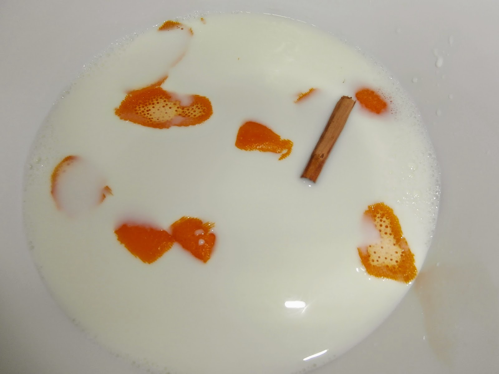 Ponemos en un bol apto para microondas la leche, la rama de canela, la piel de la naranja y las 4 cucharadas de azúcar. Removemos y calentamos en el microondas durante 2 minutos.