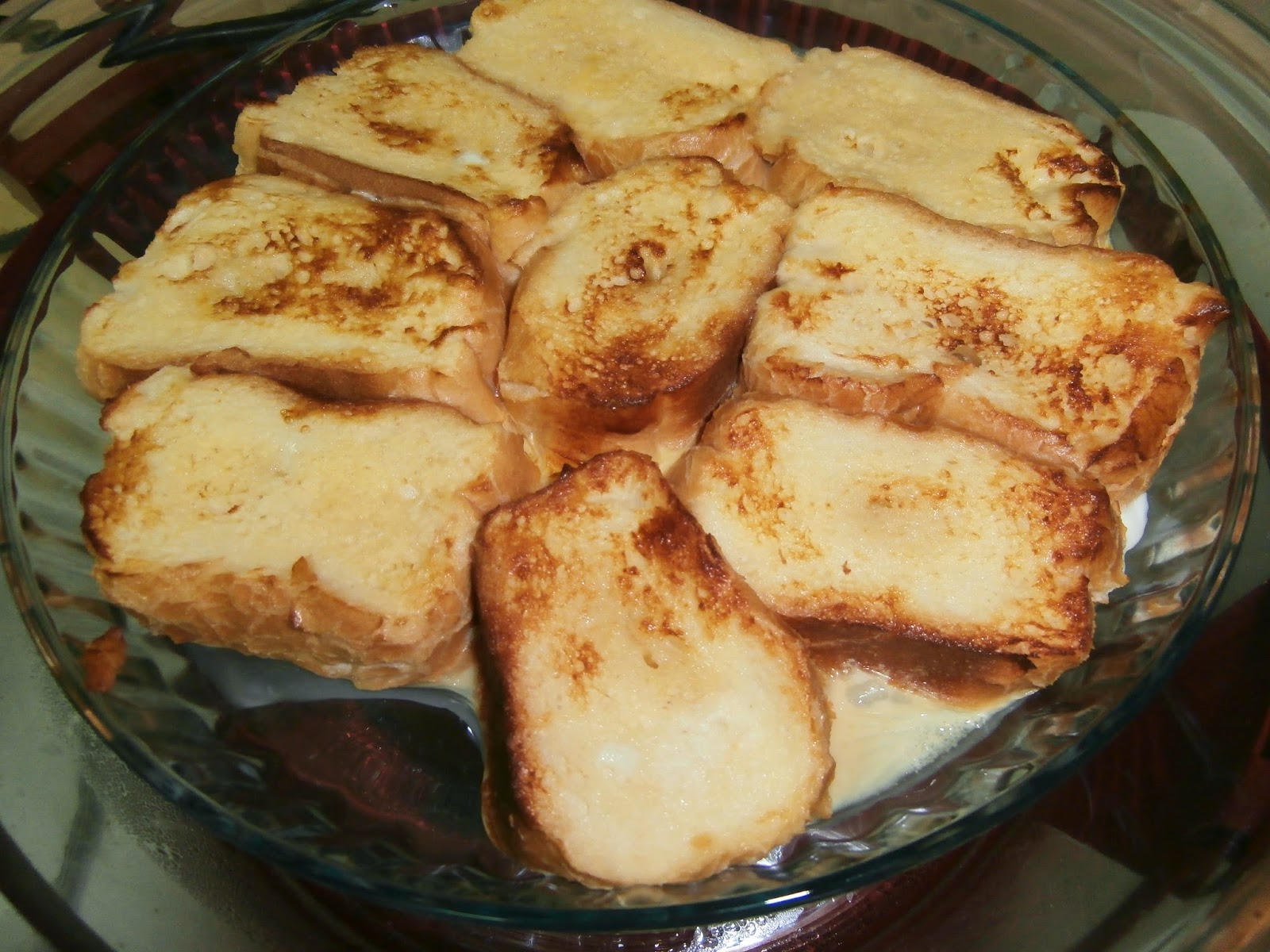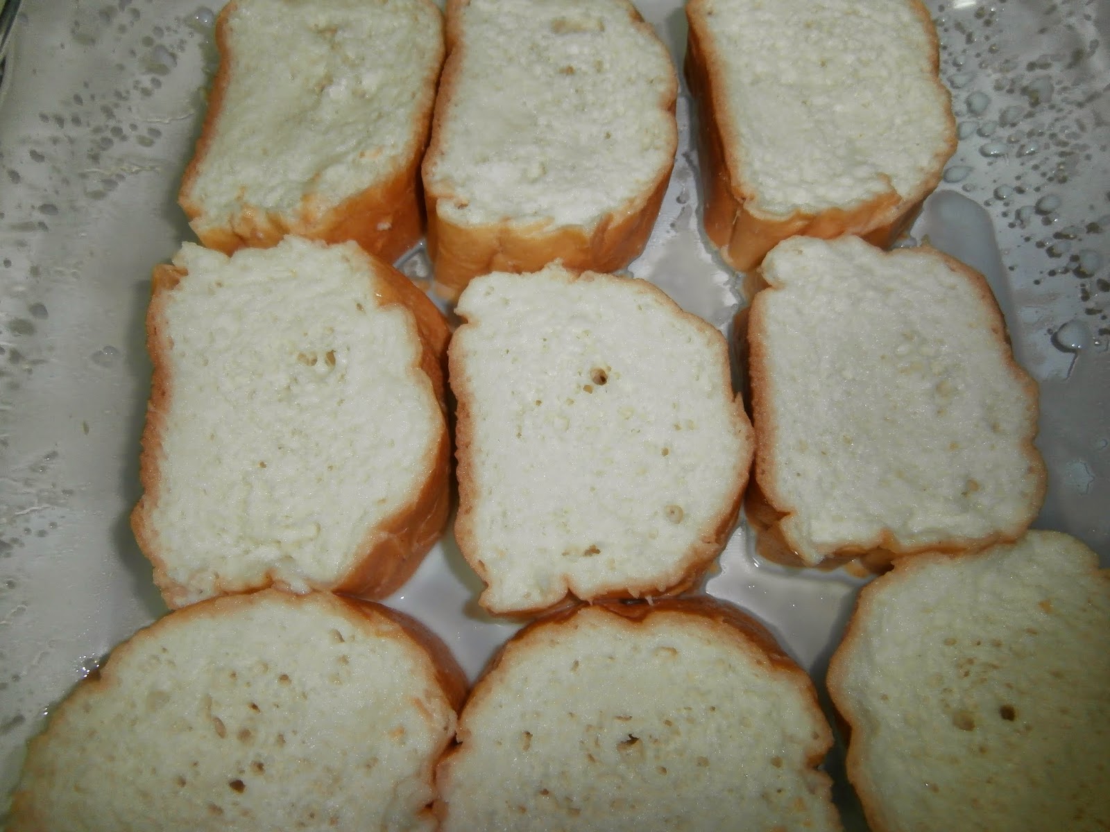 En una fuente de horno colocamos las rebanadas de pan y las empapamos con la leche caliente.