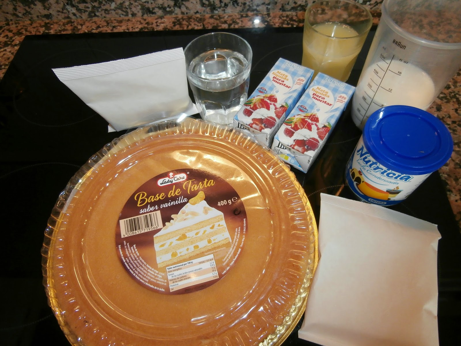 250gr de leche, 1 sobre y medio de gelatina de limon (120gr de gelatina), 150gr de zumo de limón, 370gr de leche condensada (1 bote pequeño), 400gr de nata para montar.