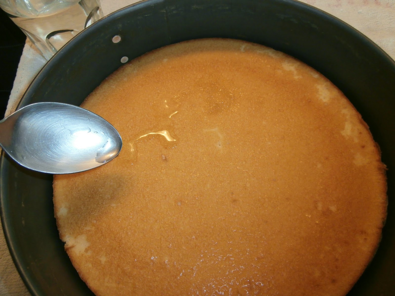 Bañamos con ayuda de una cuchara o una brocha el bizcocho y reservamos en la nevera.