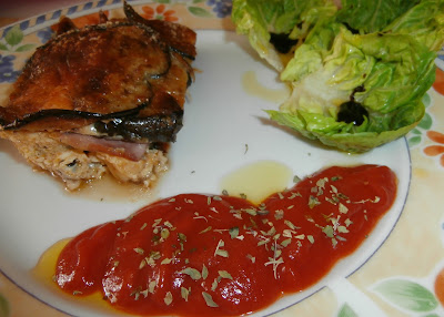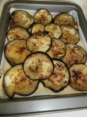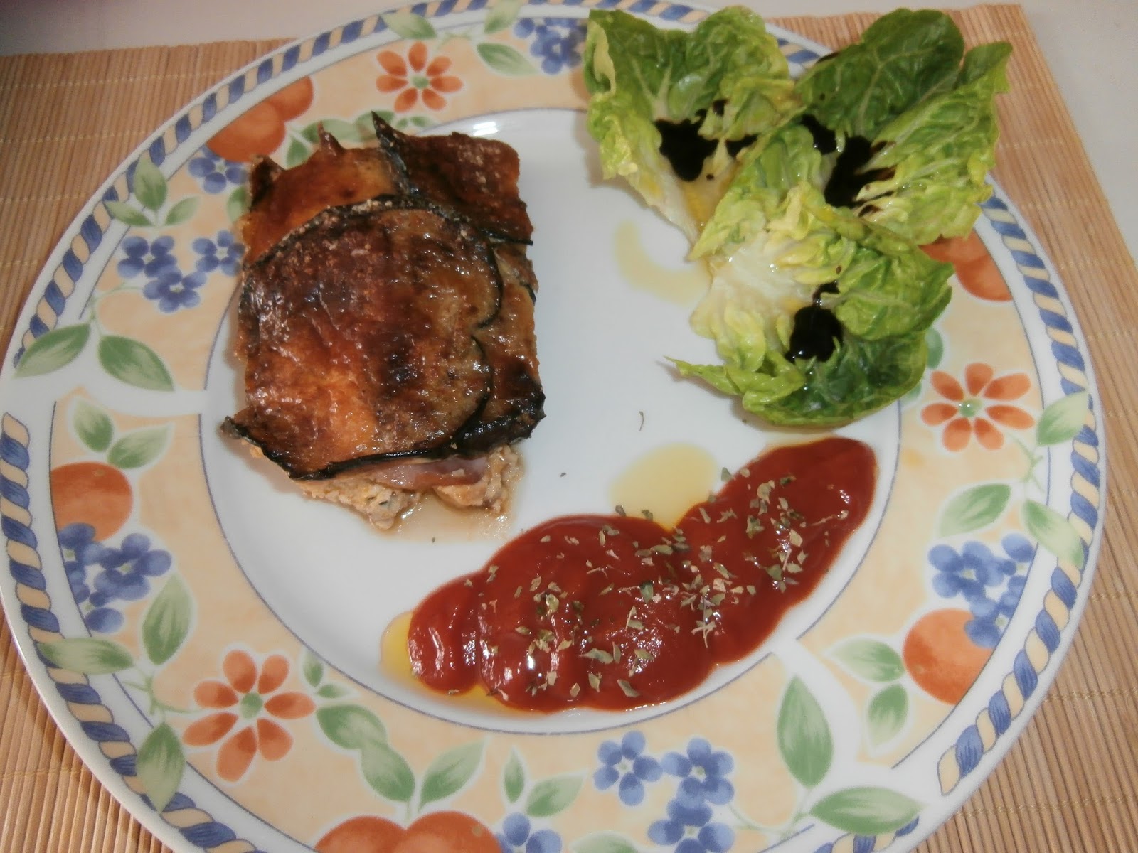 Y colocamos las rodajas de berenjena, untamos con tomate frito.