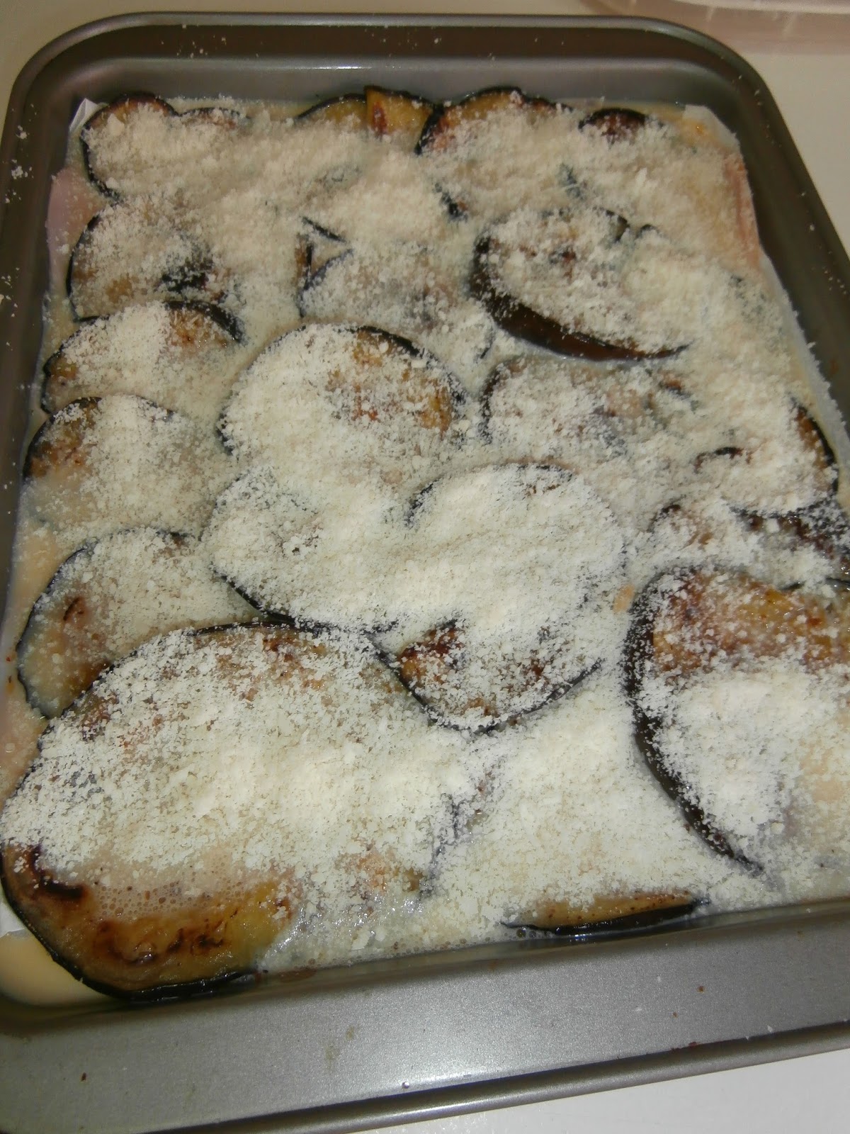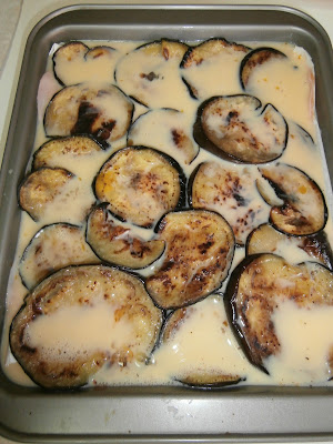 Ponemos otra capa de berenjena, jamón york, queso y terminamos con otra capa de berenjena.