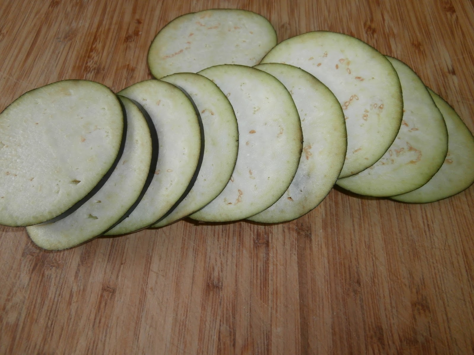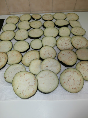 Limpiamos las berenjenas, las cortamos en rodajas finas.