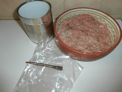 Abrimos una bolsa de asar, introducimos la carne picada y la metemos toda en la lata ,la aplastamos bien para que quede bien compacta.